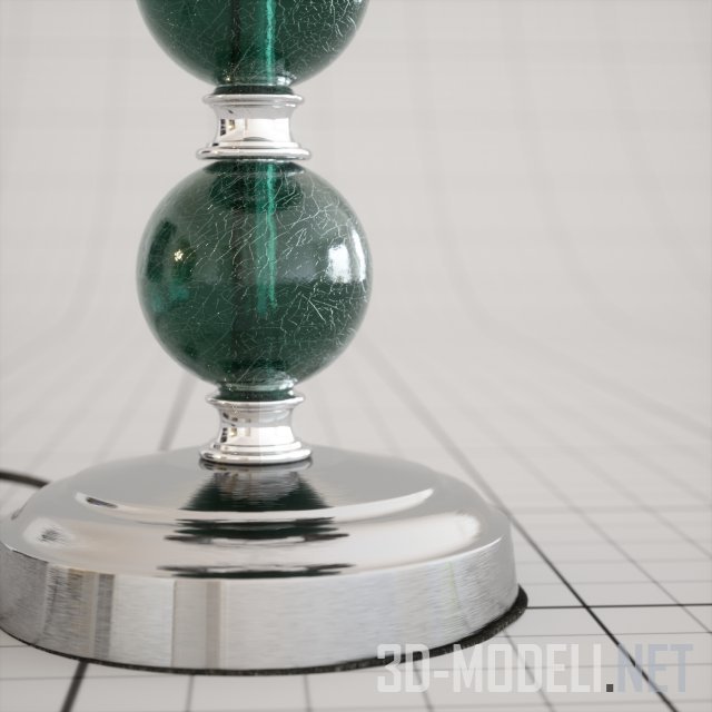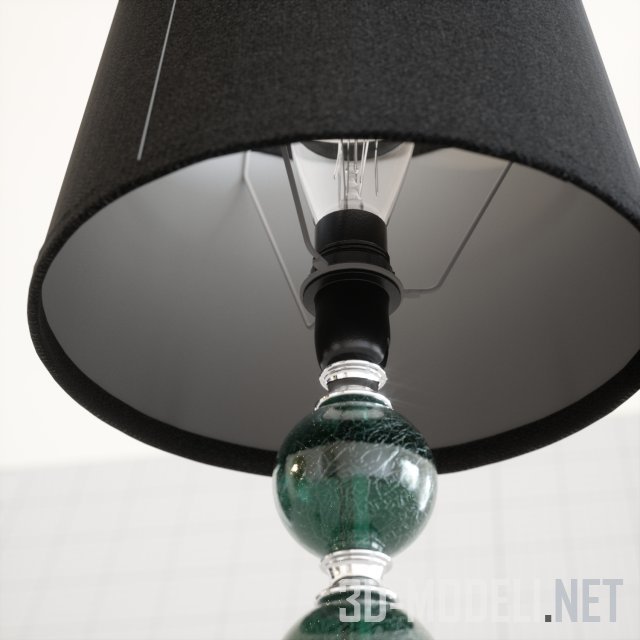 Настольная лампа в стиле арт-деко. На круглой хромированной подставке закреплена ножка светильника, собранная из трех стеклянных шаров глубокого зеленого цвета с прожилками и трещинками, с перекладкой из хромированных элементов. Абажур классической формы изготовлен из черной с ворсинками ткани.