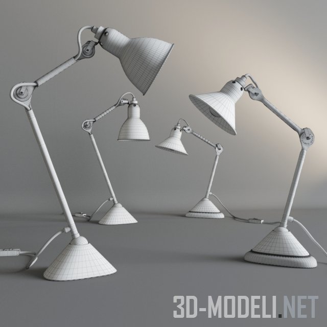 Серия современных настольных ламп La Lampe GRAS (Франция), Тросы крепятся с помощью основы и изгибаются в зависимости от поворота плеч светильников. Архив содержит модели: 205 BL, 205 WH, 207 CH, 207 BL.