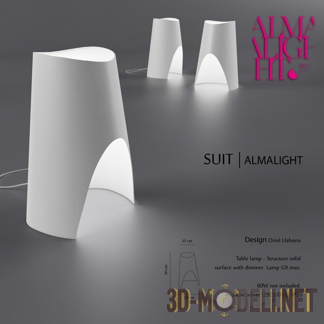 3D модель настольного светильника от производителя ALMA LIGHT, дизайн Oriol Llahona, коллекция Suit SUIT. Степень защиты - IP20, размеры - W200, H300, L200. Стильный и современный светильник с настроенными материалами, переведен в edit poly.