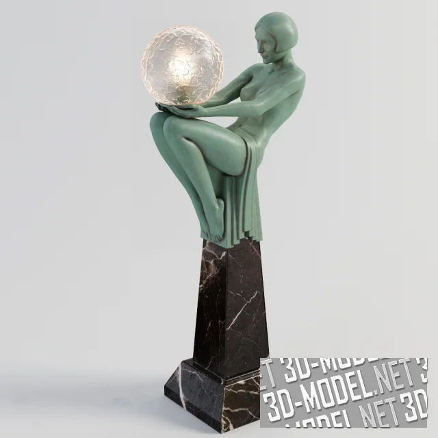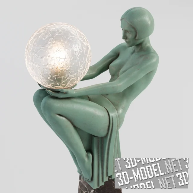 Max Le Verrier) в 1925 году, представляет собой яркий образец стиля ар-деко. Лампа выполнена в виде женской фигуры, сидящей на мраморном постаменте. Скульптурная форма отличается плавными линиями, вытянутыми пропорциями и характерной геометрией, присущей эстетике того времени. Девушка удерживает в вытянутых руках стеклянный плафон-шар с эффектом трещин, благодаря чему свет проходит мягко и рассеянно, создавая атмосферное свечение.