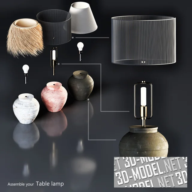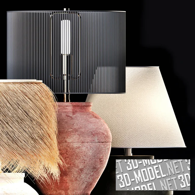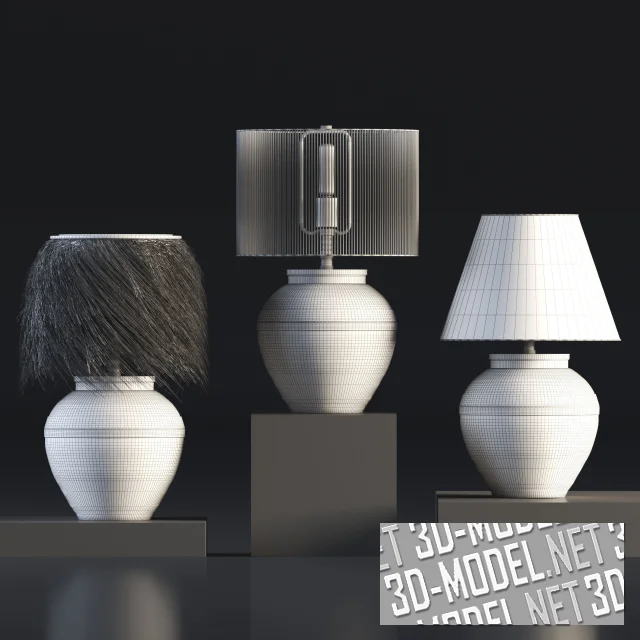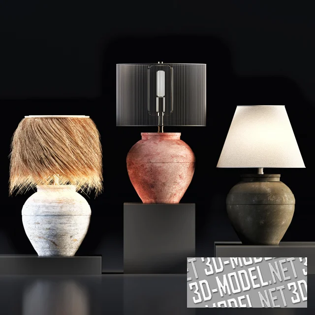 Три настольные лампы с основанием в виде рустикальных керамических горшков с разными абажурами. Представлено три варианта. Первый - грязно-белое основание с потертостями и абажур из сухой травы. Второй - терракотовый со светлыми разводами с цилиндрическим абажуром из металлической решетки. Третий - с землисто-черным основанием и элегантным белым тканевым абажуром в виде усеченного конуса.