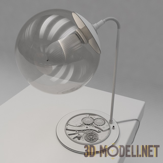 3d модель настольной лампы с круглым стеклянным абажуром, сквозь который просматривается белый нагревательный элемент ретро-лампочки. Круглое основание с различными винтиками и шестеренками дополняет впечатление винтажности. Модель с текстурами.