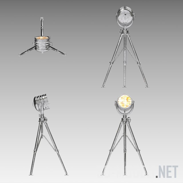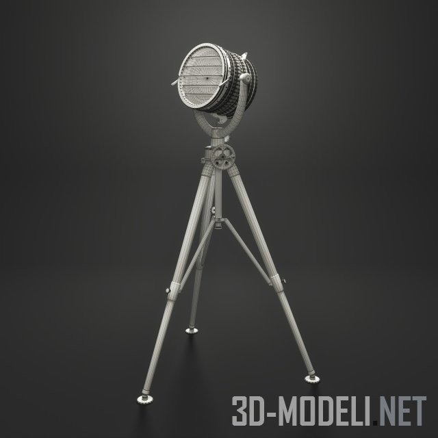 Стильный напольный светильник от Restoration Hardware, модель Royal Master Sealight. Само название говорит о стилизации светильника. Он выполнен в виде сигнального корабельного прожектора с колесом-маховиком, позволяющим регулировать высоту корпуса, на треноге, с выдвижными ножками. Такими прожекторами передавались сообщения с корабля на корабль с помощью азбуки Морзе. Поверхности элементов корпуса светильника и треноги выполнены из хромированного металла.
