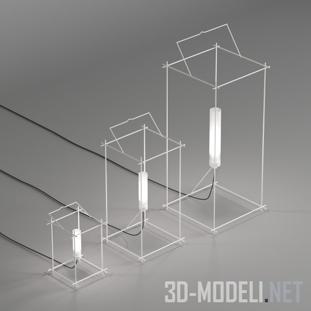 Три напольных легких светильника производства Antonangeli, модель Libera Outdoor (файл включает в себя три разных размера лампы, согласно официальному сайту: Small, Medium, Big). Светильники отличаются размером каркаса и стеклянной матовой колбы плафона. Каркасы корпусов выполнены из тонких металлических прутиков, выкрашены в белый.