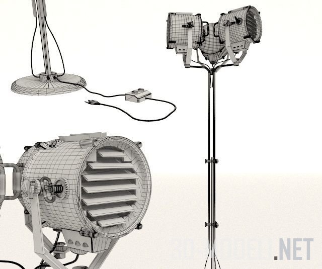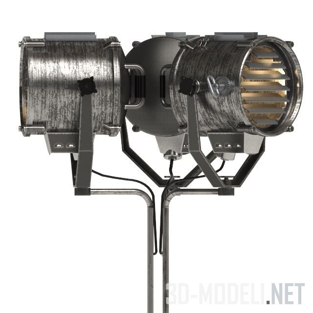 Напольный светильник в виде корабельного сигнального фонаря. На высокой металлической подставке разместились три металлических «барабана» с решеткой жалюзи на передних плоскостях «прожекторов». Отделка корпусов выполнена в виде рустикального металла.