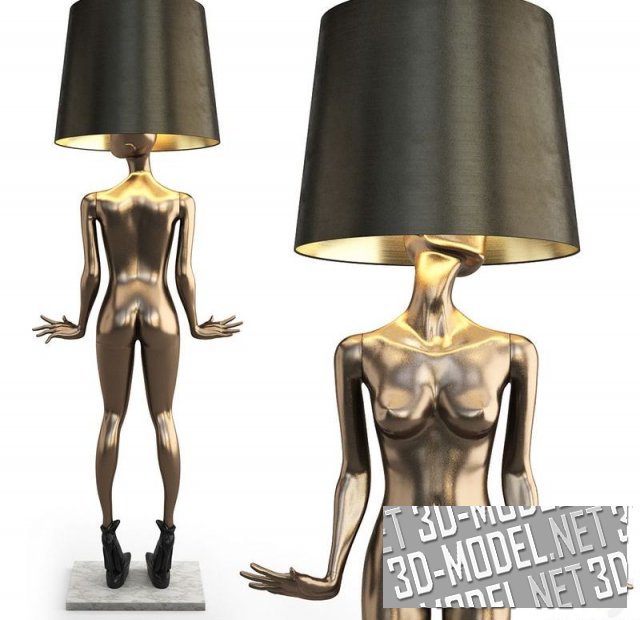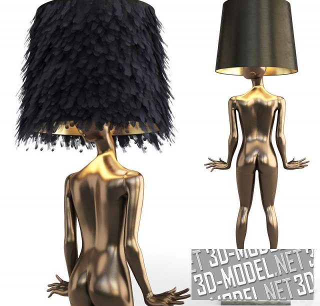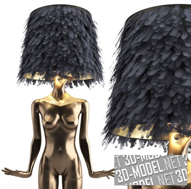 Игривый, немного эпатажный, но однозначно привлекательный вариант напольного освещения – торшер Frederika. Светильник изготовлен в виде манекена. Женская обнаженная фигура предлагается в разных вариантах отделки, что создает дополнительные интерьерные возможности. Абажур-шляпа сделан из черных перьев, что органично вписывается в общий дизайн. Размеры торшера: 2400 х 800 х 600 мм.