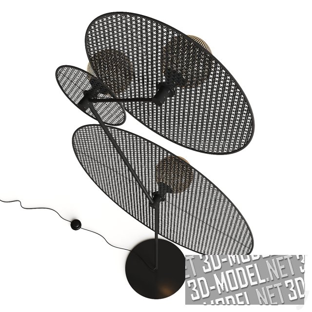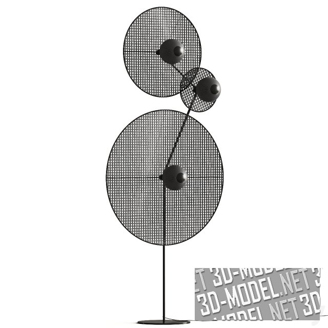 Современный торшер Arсtic от Aromas Del Campo (дизайнер: Pepe Fornas). В узлах трехсоставной черной стойки на круглой подставке закреплены три черных круга разного диаметра, заполненные тонкой ажурной решеткой. В центрах кругов размещены шарообразные плафоны с нанесенной на них тонкой черной сеточкой. Габарит светильника: 101х40,5х205см.