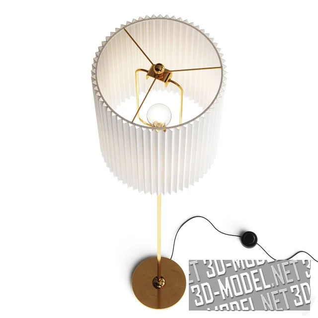 Классический торшер CB2 Marceau Boule, с белым тканевым плиссированным цилиндрическим абажуром на высокой тонкой латунной стойке с круглым основанием. Трубка стойки декорирована двумя латунными шарами. Первый смонтирован в нижнем основании трубки. Второй «нанизан» на трубку и закреплен выше середины стойки. Еще один шар меньшего диаметра венчает стойку. Габарит светильника: d30смхh158см.