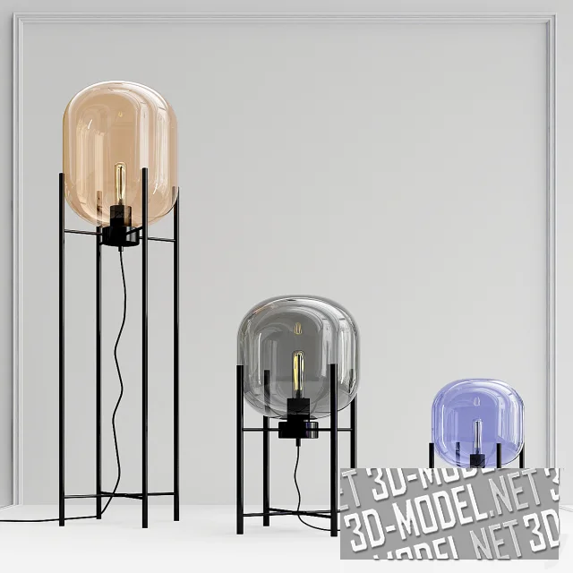 Современные напольные светильники Lzpz Rui. Светильники представлены в трех типоразмерах, с крупными овальными плафонами из цветного стекла (синего, серого и бежевого тонов) на четырехногих металлических черных подставках. В патроне - светодиодные лампы ретро-дизайна с пробиркообразными колбами.