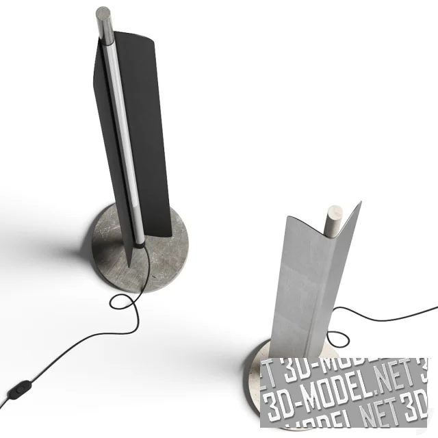 Светильник установлен на круглой каменной площадке. Из материала площадки изготовлена верхушка стойки. Представлено два варианта декор: серый мрамор подставки с черным рефлектором из анодированного алюминия «Deep Sea» и светлый травертин подставки с серебристым матовым алюминиевым рефлектором. Габарит торшера: d22,86/h182,88см.