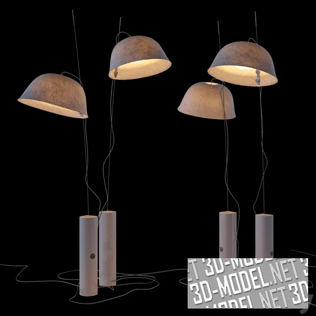Вертикальная стальная спица, торчащая из верхнего торца мраморного цилиндра, служит стойкой для легкого колоколообразного абажура из коричневатой бумаги. Благодаря магнитному креплению, встроенному в колпак абажура, можно легко поменять высоту его расположения и угол наклона на спице.