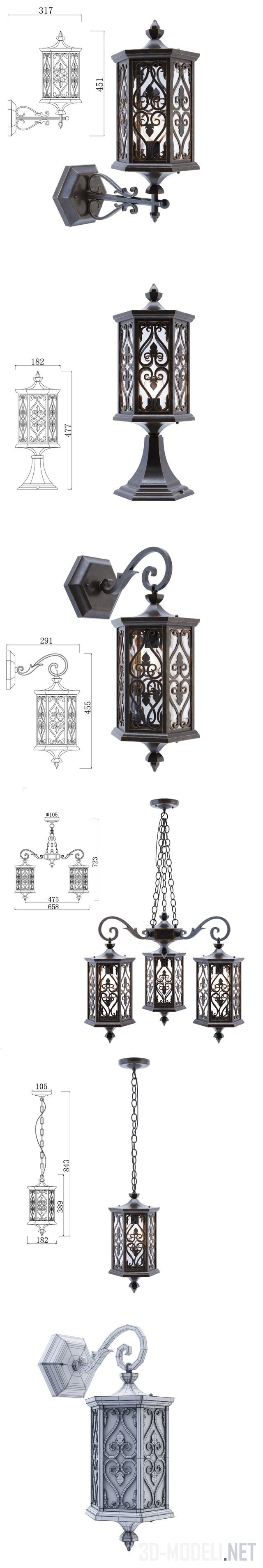 Набор красивых светильников SUSPENSION STREET LUMINER: люстра, подвеска с одним фонарем, бра с двумя различными вариантами крепления и настольный фонарь. Корпус из металла, устойчивый к перепадам температуры. Покрытие темно-бронзового цвета. Плафон из прозрачного стекла украшен декоративной ковкой в марокканском стиле.