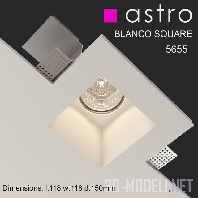Квадратной формы, встраиваемый интерьерный потолочный светильник Blanco square 5655 от Astro. Светильник отличается гипсовой отделкой. Ламп GU10, мощность 50 Вт. Подходит для ванной комнаты.
