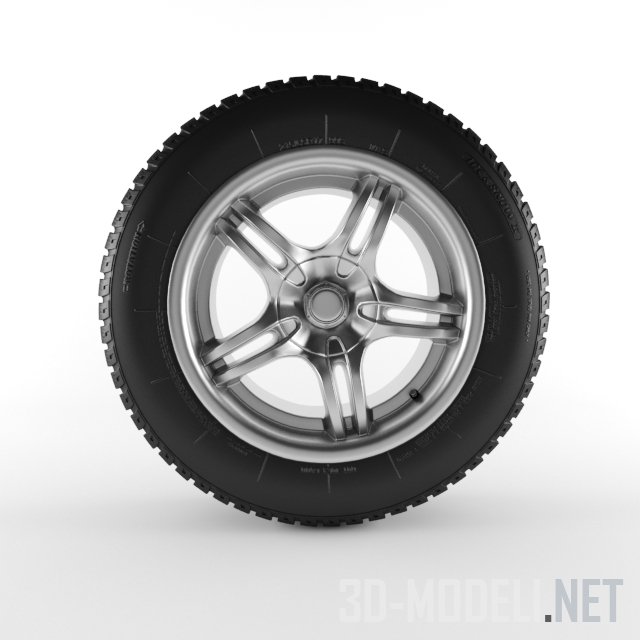 Реалистично выполненная трехмерная модель - шина для легкового автомобиля. Покрышка черного цвета, с блестящим металлическим диском.