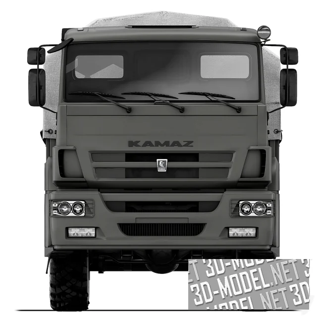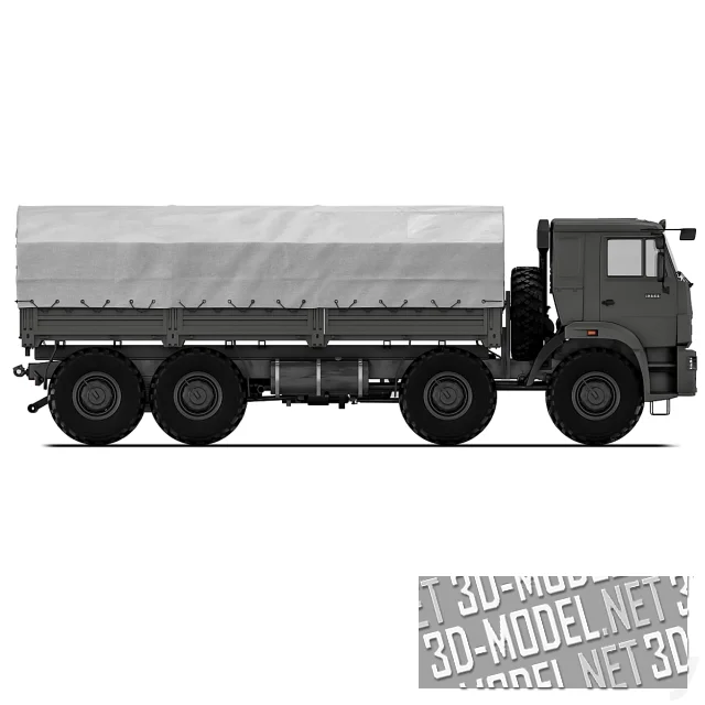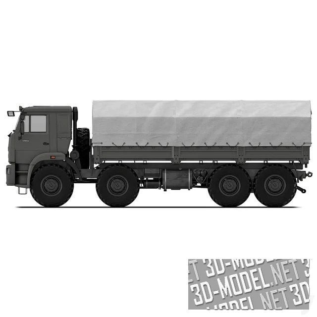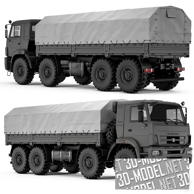 Тентованный грузовик КамАЗ 8х8 – мощный полноприводный тяжелый автомобиль, рассчитанный на работу в сложных дорожных и климатических условиях. Высокая кабина современного образца, усиленное шасси с четырьмя ведущими осями и вместительная бортовая платформа под тент позволяют перевозить большие партии грузов, оборудование и личный состав, защищая содержимое от осадков и пыли. Брутальная геометрия кузова, крупный протектор шин и аккуратно смоделированный тент делают модель выразительным акцентом для любых военных, спецтранспортных или индустриальных сцен.