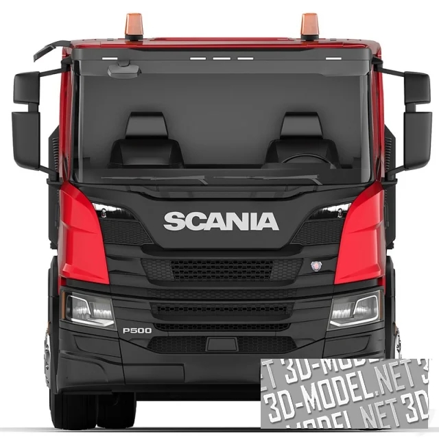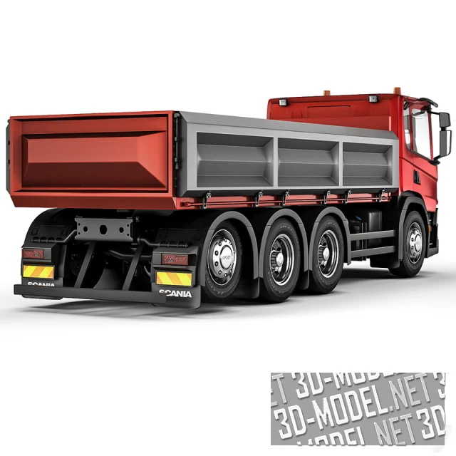 Современный четырехосный самосвал Scania P500, выпуска 2018 года. Часто используется при транспортировке строительных грузов, в коммунальном хозяйстве, в агротехнике, для городских и региональных перевозок. Кабина и элементы кузова - красного и черного цветов. Боковые борта серые. На кабине смонтированы две мигалки.