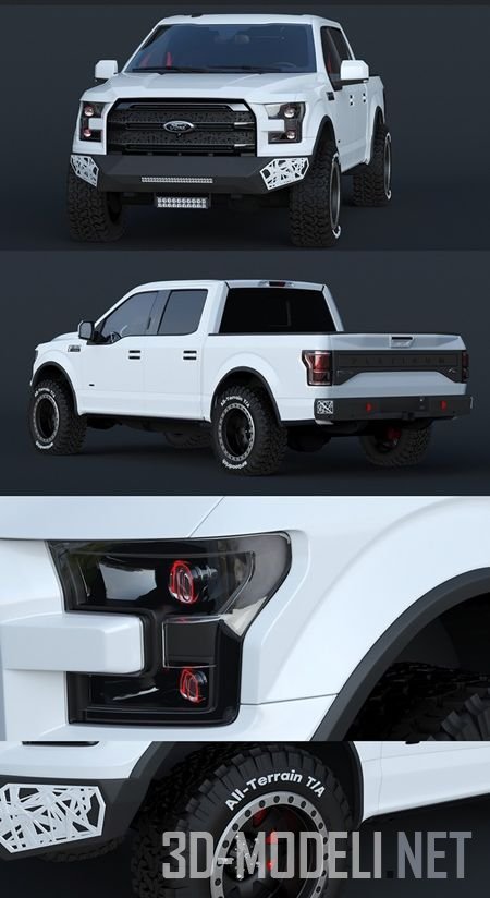 Модель легкового грузовика Ford F150 Raptor с современным агрессивным силуэтом, с тюнингом от ARE. Белый кузов гармонично сочетается с черными бамперами, и радиаторной решеткой. На передний бампер нанесены белые деколи в виде геометрического рисунка.
