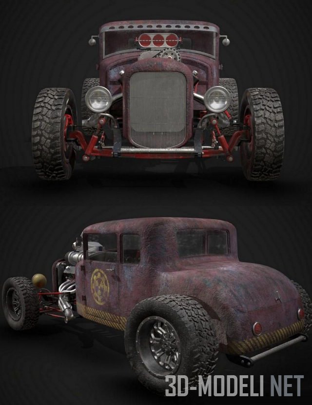 Ржавый старинный «Хот-род» в стиле компьютерной игры Fallout. Двигатель, расположенный в передней части автомобиля, открытый, турбированный. На ржавой, рустикальной поверхности кузова автомобиля помещен полустертый логотип в виде символа радиоактивности в шестеренке и круге.