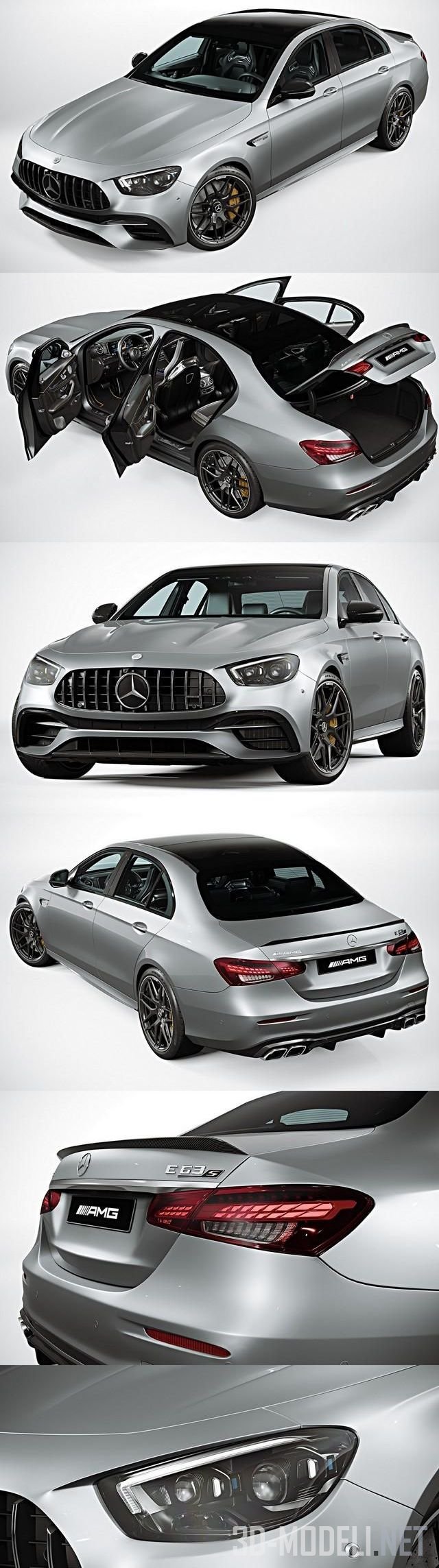 Современный автомобиль от концерна Mercedes. Модель E63 Sedan AMG 2021 года. Серебристый кузов, черная кожаная отделка салона, низкопрофильная резина, тщательная проработка деталей делают автомобиль реалистичным и качественным.