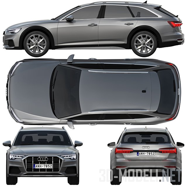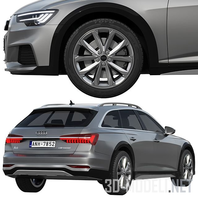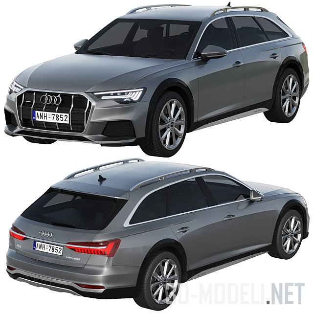 Высокодетализированная трехмерная модель современного автомобиля Audi A6 Allroad Quattro. Корпус в сером цвете Manhattan Grey с эффектом «металлик». Автомобиль имеет прекрасный внешний дизайн. Решётка радиатора Singleframe с вертикальными планками выглядит оригинально и современно. Нижние части переднего и заднего бамперов, накладки колёсных арок и пороги окрашены в контрастный черный цвет.