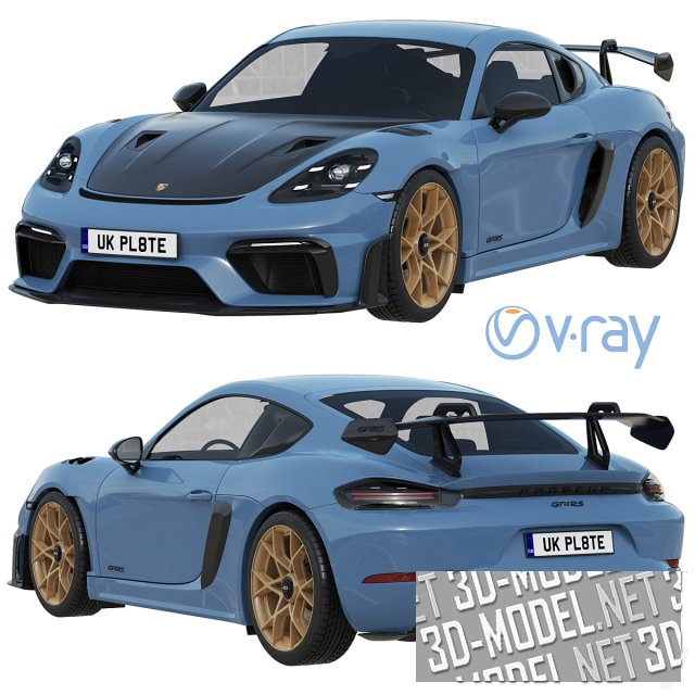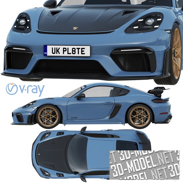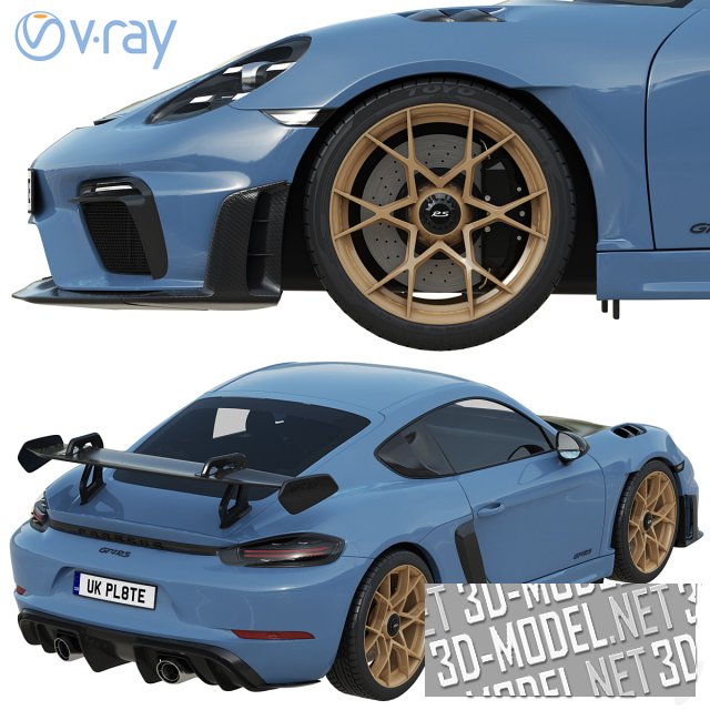 Современный трековый болид Porsche 718 Cayman GT4 RS. Автомобиль 2022, в красивом сочетании серо-синего с черными элементами кузова и песочного цвета литыми дисками.