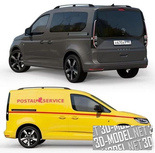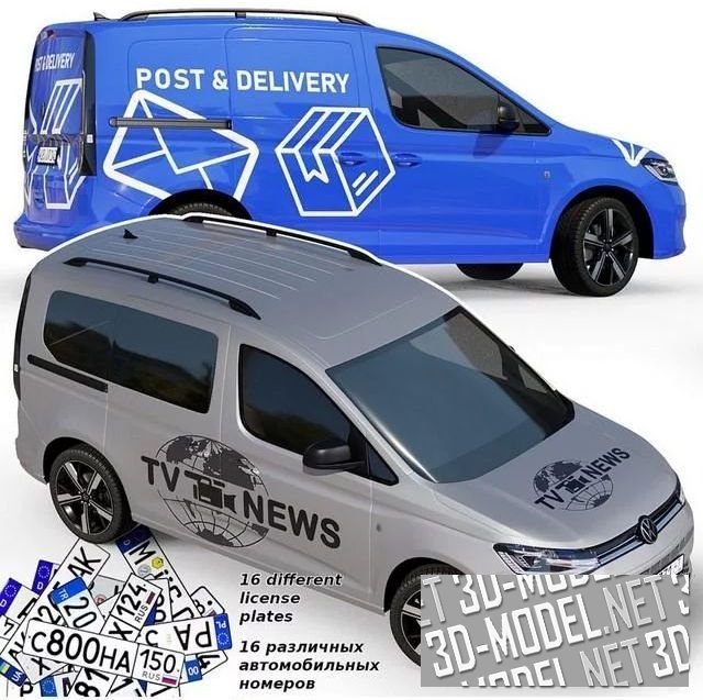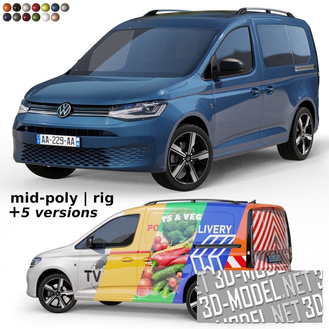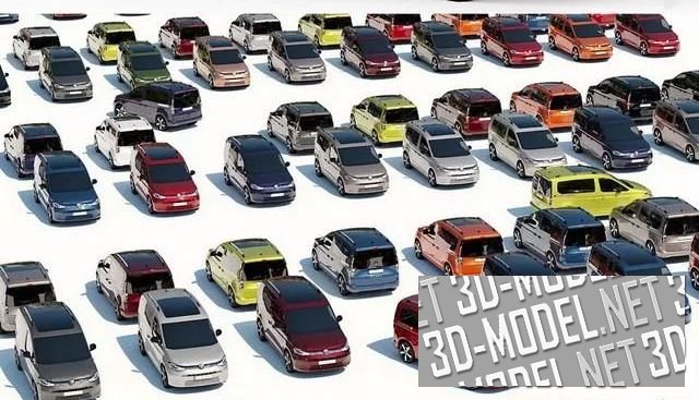 Компактный грузо-пассажирский фургончик Volkswagen Caddy, выпуска 2022. Представлены различные цвета и варианты с принтами на бортах, представляющие различные службы, в которых авто может использоваться.