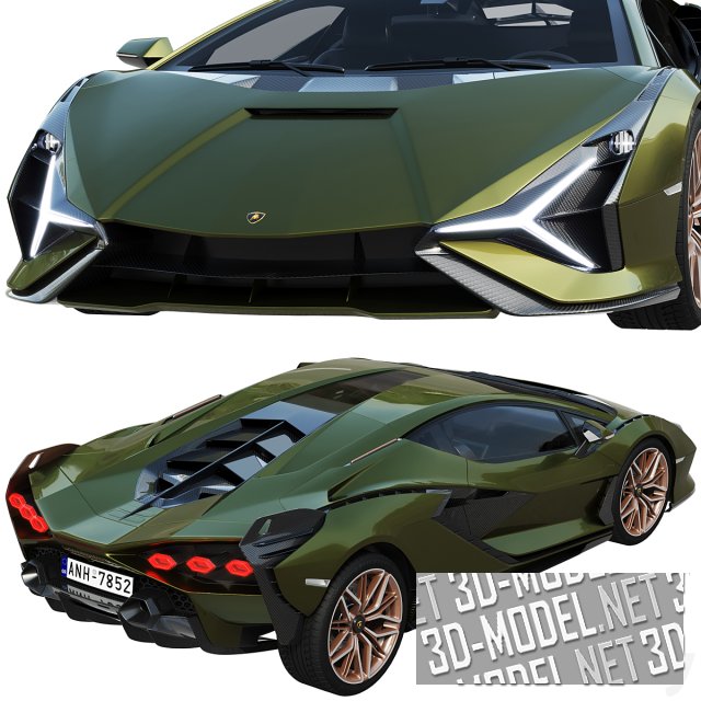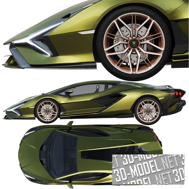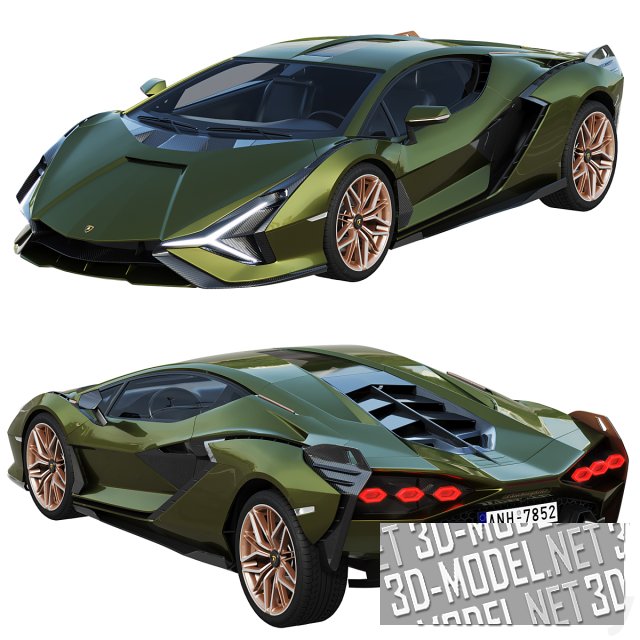 Современный суперкар от итальянской компании Lamborghini - Sian. Автомобиль с традиционно-агрессивным силуэтом кузова болотно-зеленого цвета. Вставки из черного карбона отлично вписались в экстерьер. Первый подзаряжаемый гибрид Lamborghini выпускался в период с 2020 по 2022 год.