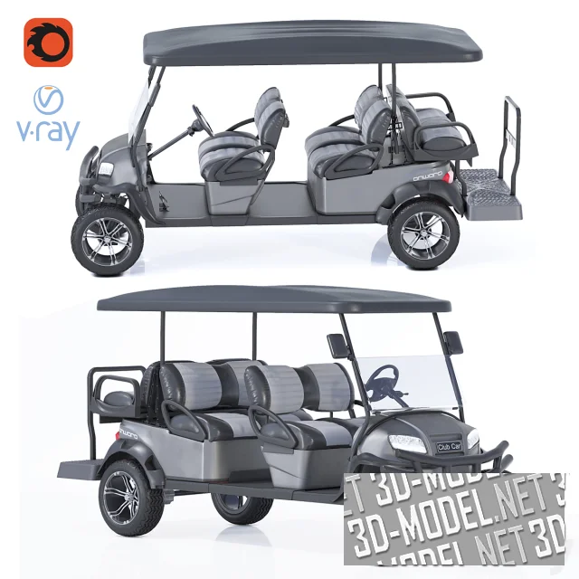Современный шестиместный клубный электрический гольф-кар в серых тонах. Над сиденьями с мягкой обивкой (четыре направлены вперед, два - назад) размещена серая пластиковая крыша на металлической раме.