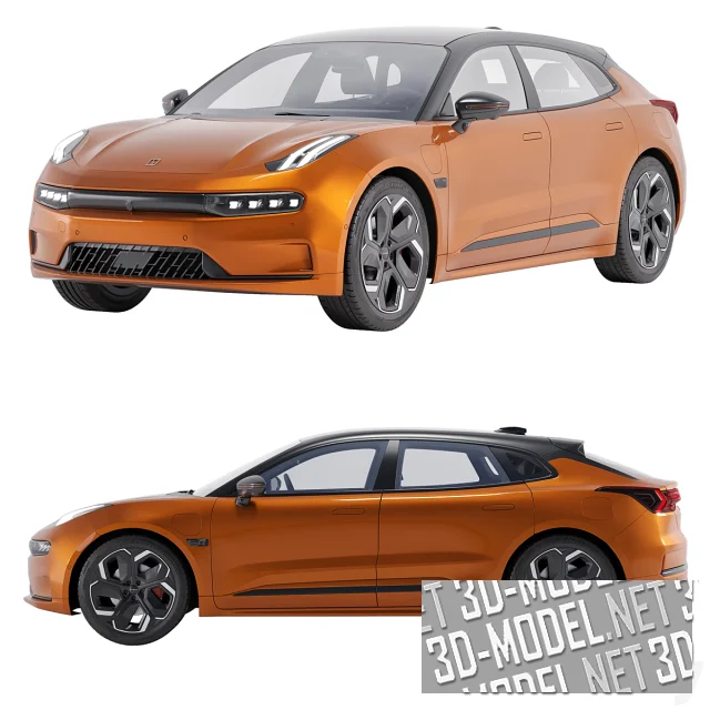Современный высококачественный спортбек электрокар Zeekr от концерна Geely Holding Group. Автомобиль представлен в кузове оранжевого цвета.