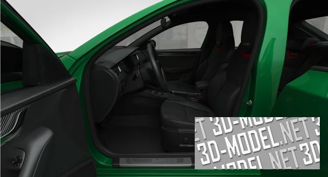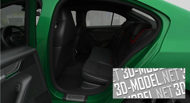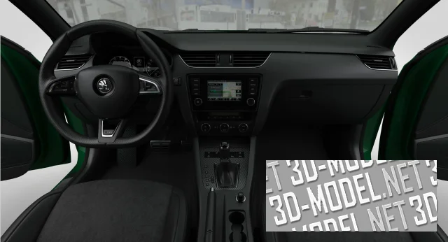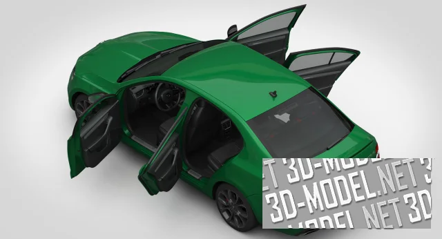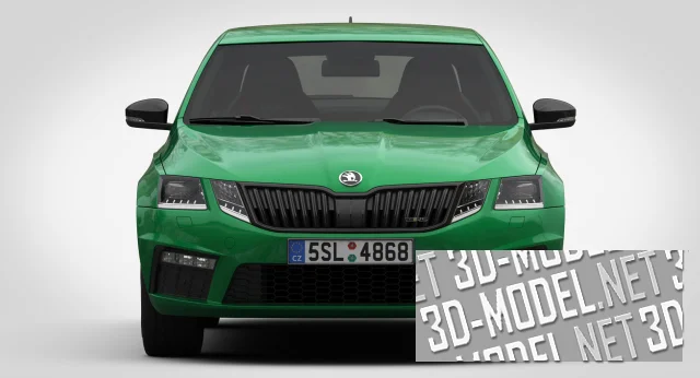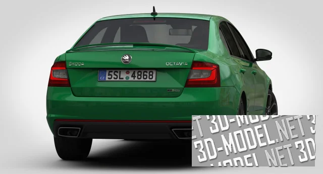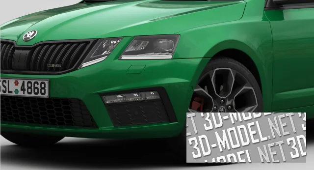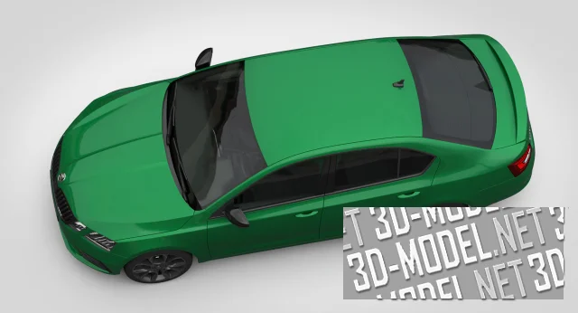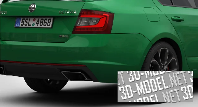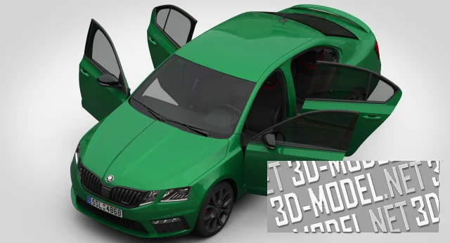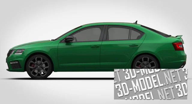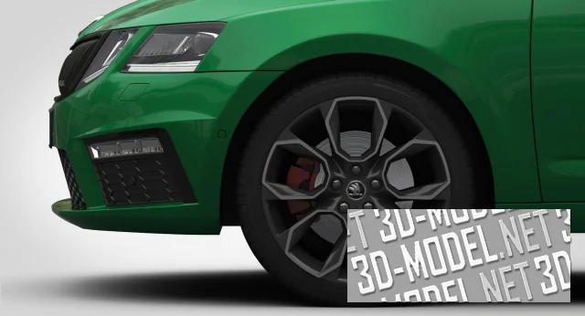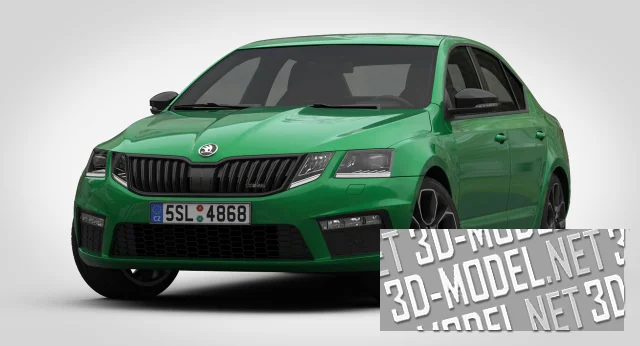 Четырехдверный седан Skoda Octavia RS 2017. Популярный автомобиль имеет стильный экстерьер в сочетании черного и изумрудно-зеленого цветов. Фотореалистичная трехмерная модель высокого качества. Автомобиль выполнен в натуральную величину (длина 4670 мм, ширина 1814 мм, высота 1461 мм, колесная база - 2686 мм).