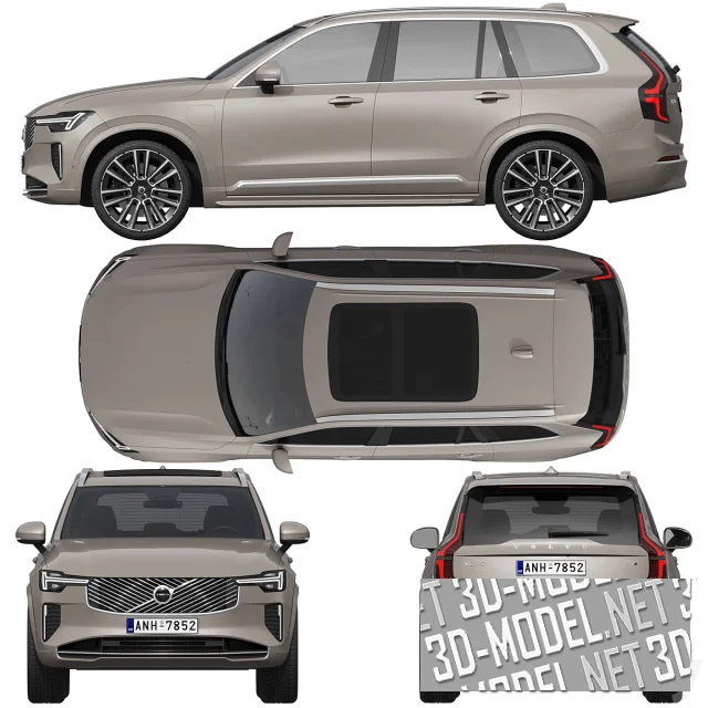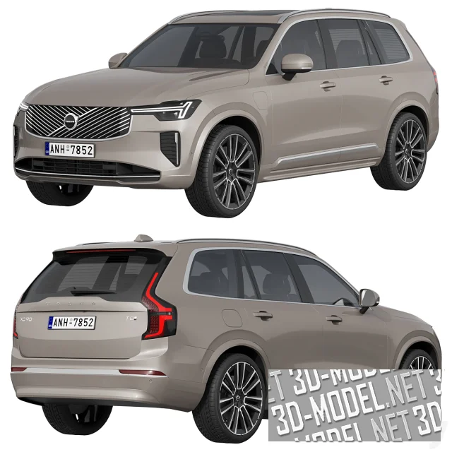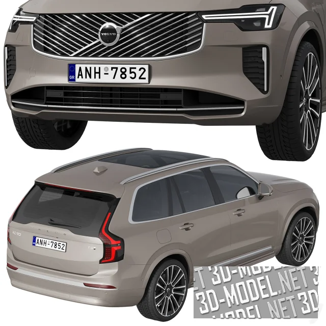 Современный 7-местный гибридный семейный внедорожник Volvo XC90, 2025 года. Кузов автомобиля - бледно-серо-коричневый, декорирован хромированными элементами (диски, решетки радиатора, молдинги вокруг боковых окон).