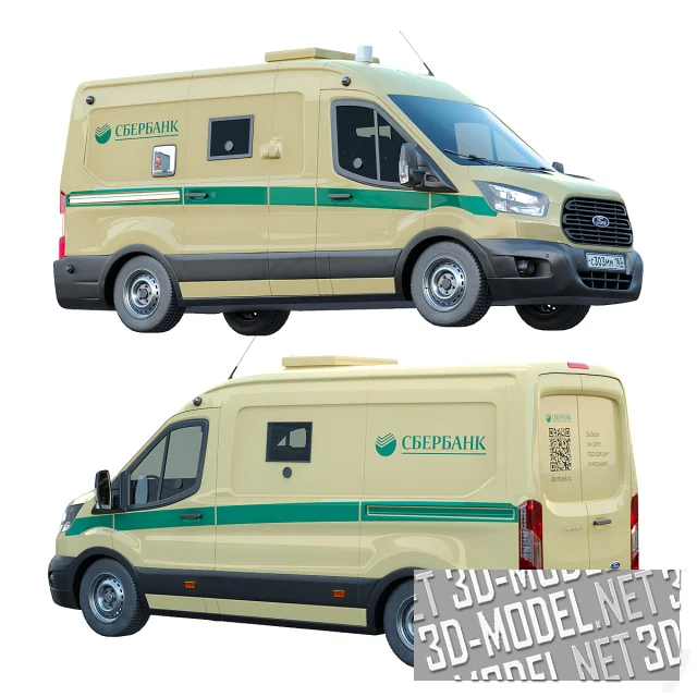 Специализированный автомобиль на базе Ford Transit оформлен в фирменной цветовой гамме с узнаваемыми элементами брендинга. Имеет высокую крышу, усиленный кузов и дополнительные защитные элементы по периметру, что подчеркивает предназначение для задач повышенной надежности.