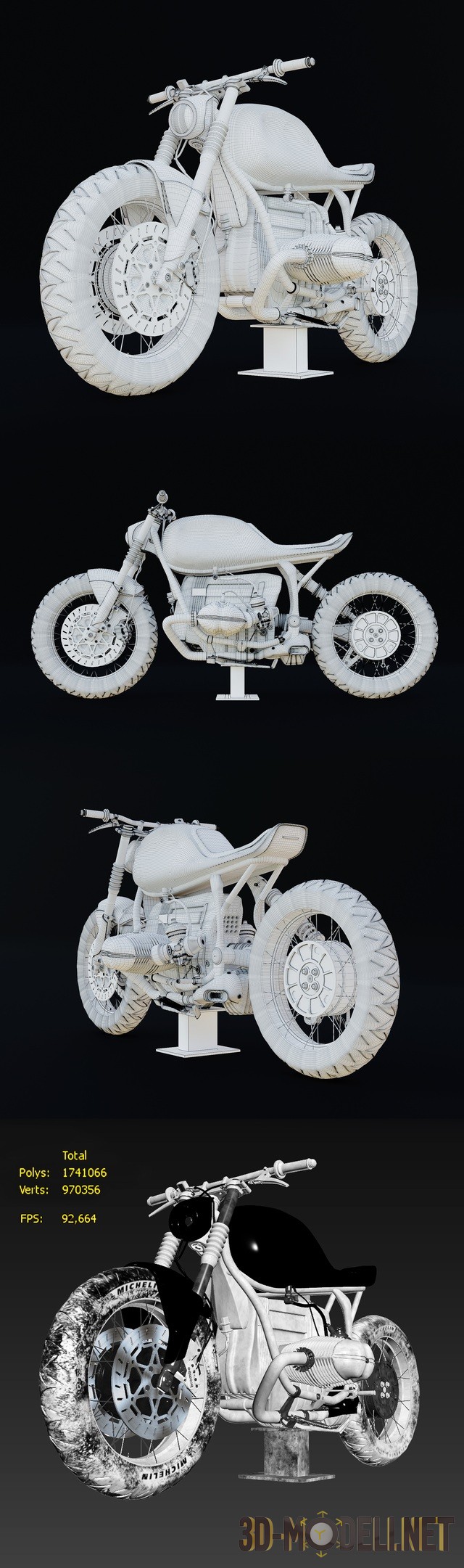 Дизайнерская ретро-версия мотоцикла BMW R100R. Прекрасная 3D модель с великолепной детализацией и реалистичными материалами для Corona render. Все необходимые текстуры включены в архив.