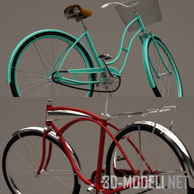 Реалистичная 3d модель двух велосипедов в ретро-стиле. Представлены голубой и красный варианты.