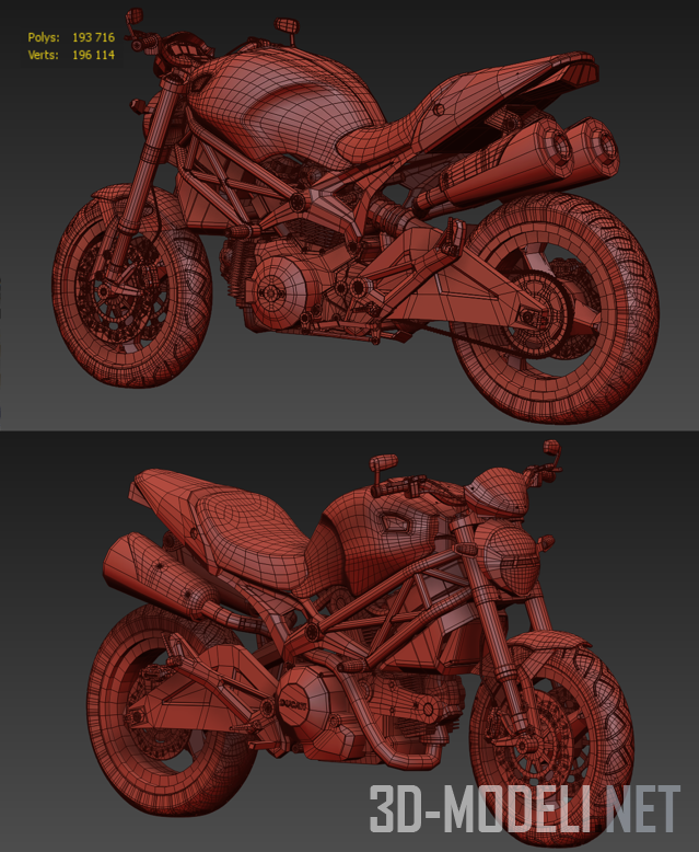 Дорожный мотоцикл Ducati Monster 696. Модельный год: 2012. Рабочий объем: составляет 696 см3. Мощность, л.с .: 80, снаряженная масса: 185 кг. Трехмерная модель соответствует оригиналу, текстуры присутствуют.