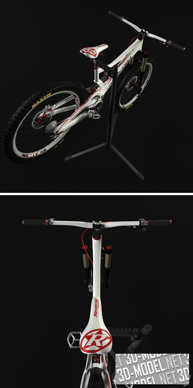 Современный горный велосипед Morewood Makulu на черной стойке для обслуживания и ремонта. Мощная рама велосипеда, обода колес руль и седло - белые, с множеством надписей. На трехногой стойке из мощной черной трубы размещен зажим, позволяющий фиксацию на любой высоте в диапазоне высоты трубы.