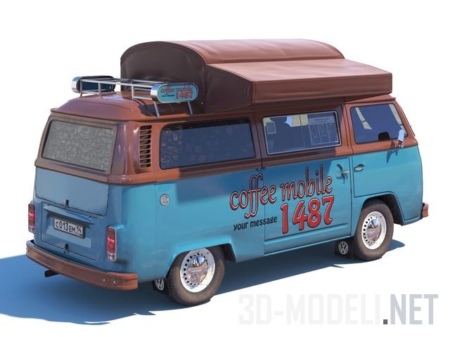 Мобильное кафе на базе винтажного минивэна Volkswagen T2. Высококачественная трехмерная модель, которая подарит любому подходящему проекту дополнительный реализм и аромат свежего кофе.