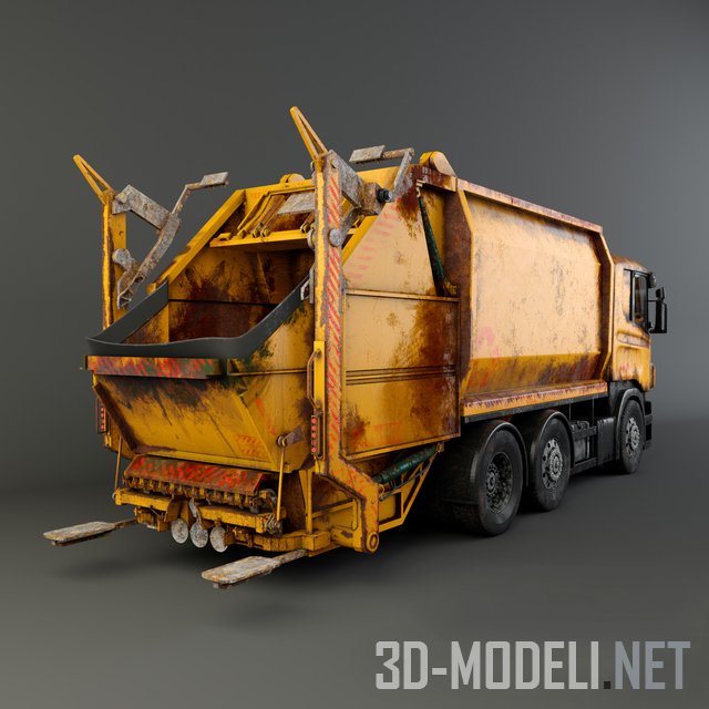 Старый, грязный, с потертостями, желтый мусоровоз с тыльной загрузкой. Грузовик выполнен на трехосевой базе. Реалистичная модель с текстурами в архиве.