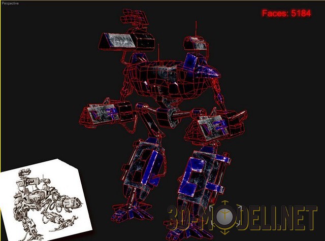 3D-модель боевого робота нового поколения (прямо как машина-убийца из первой части фильма «Робот-полицейский»). Конструкция снабжена несколькими ракетными установками, парой-тройкой лазерных установок и некоторыми другими приспособлениями, предназначение которых неизвестно даже создателю этого агрегата. Данный стальной монстр может за несколько вылазок на улицы того или иного города сжить со света десятки тысяч ни в чем не повинных людей, уничтожить тысячи транспортных средств и разрушить не одну сотню поселений. Остановить этого робота едва ли представляется возможным — во время любой крупной «заварушки» он может быть трансформирован в сверхзвуковой истребитель! Модель такой боевой машины была сконструирована Katar'ом за 4 дня (день первый — геометрия модели, день второй — маппинг, дни третий и четвертый — текстурирование). Модель носит статус low-poly объекта (состоит примерно из 5,1 тыс. полигонов). Заметим, что в комплект стандартной поставки включена одна текстура высокого разрешения — 1024x768, покрывающая робота.