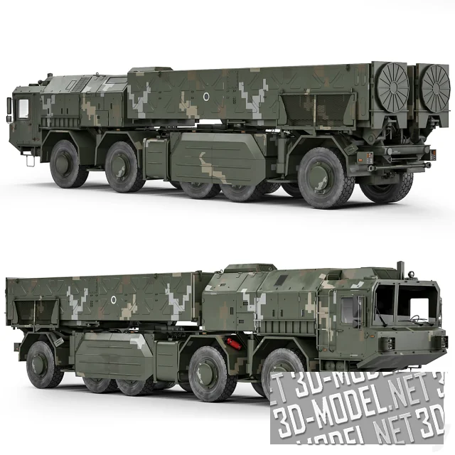 Оперативно-тактический ракетный комплекс «Гром-2» (известный также как ОТРК «Сапсан») представлен в виде крупного многоосного шасси высокой проходимости с характерным камуфляжным окрасом. На платформе размещен длинномерный пусковой модуль с контейнерами для ракет, закрытыми сверху и сзади массивными крышками-«дисками». Кабина экипажа бронирована и имеет большие лобовые стекла с широкими дворниками, по бокам расположены зеркала и вспомогательное оборудование. Ходовая часть включает несколько осей с крупными шинами военного образца, нижний объем шасси плотно занят силовыми и вспомогательными агрегатами. Конструкция общего вида подчеркивает мобильность и предназначение машины для быстрого развертывания ракетного комплекса на подготовленных позициях.