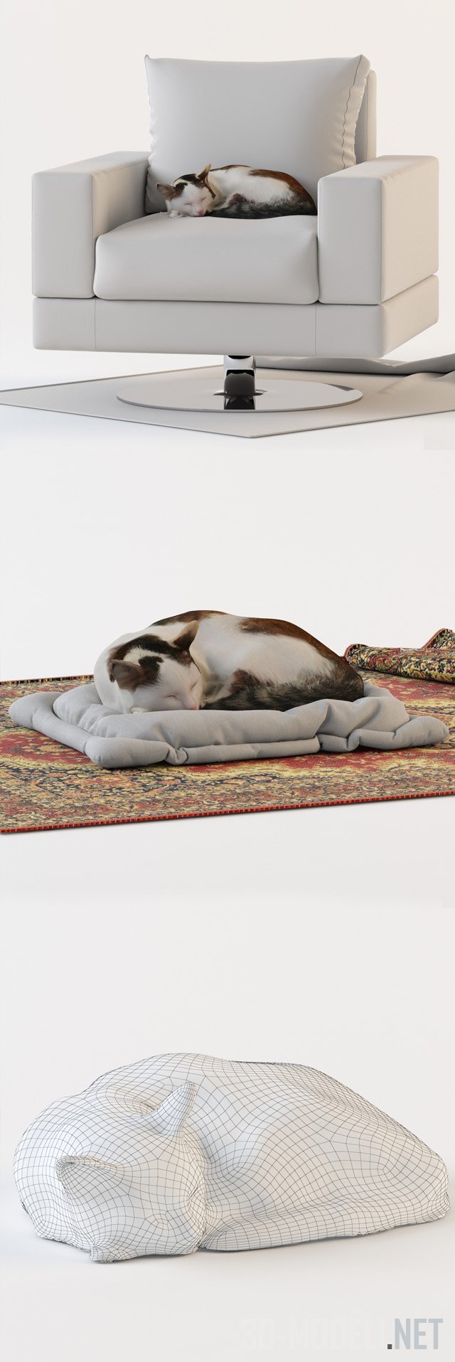 Очаровательная бело-коричневая кошка, спящая на своем белом лежачке, который лежит на большом красно-коричневом ковре, со слегка завернутым краем. Очень реалистичная 3d модель с текстурами.