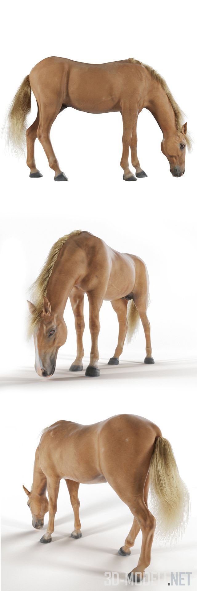 Пасущийся конь рыжего окраса. Конь с длинной гривой. Голова животного опущена вниз. Грива и хвост - светлые.