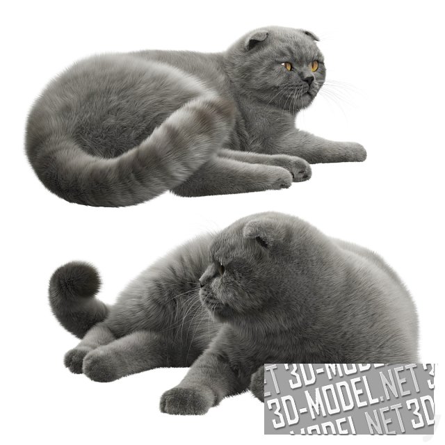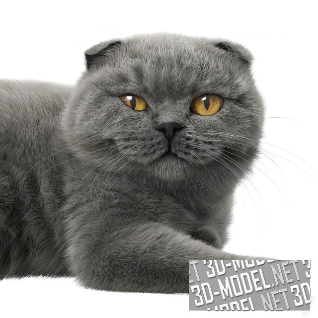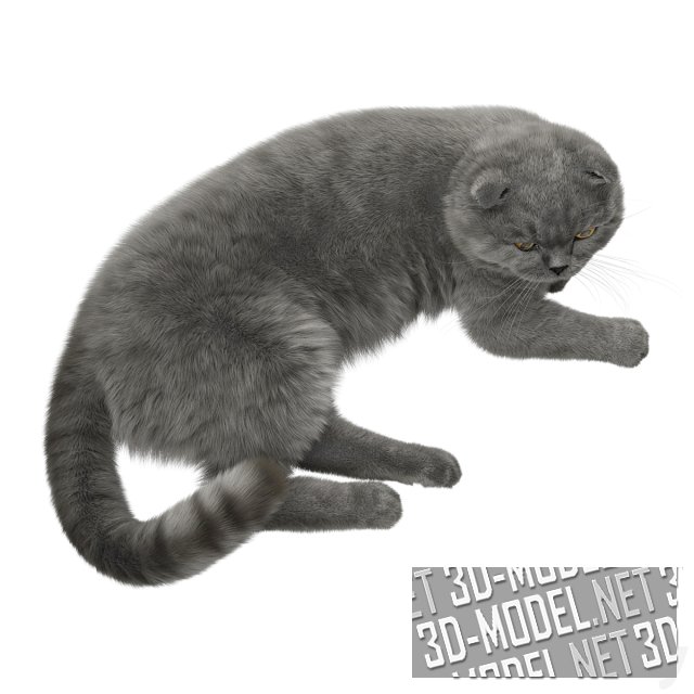 Красивая серая кошка породы шотландская вислоухая в лежащей позе. Можно использовать животное в гостиной на диване или в другом месте комнаты. Это придаст милую живую достоверность интерьеру.