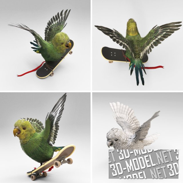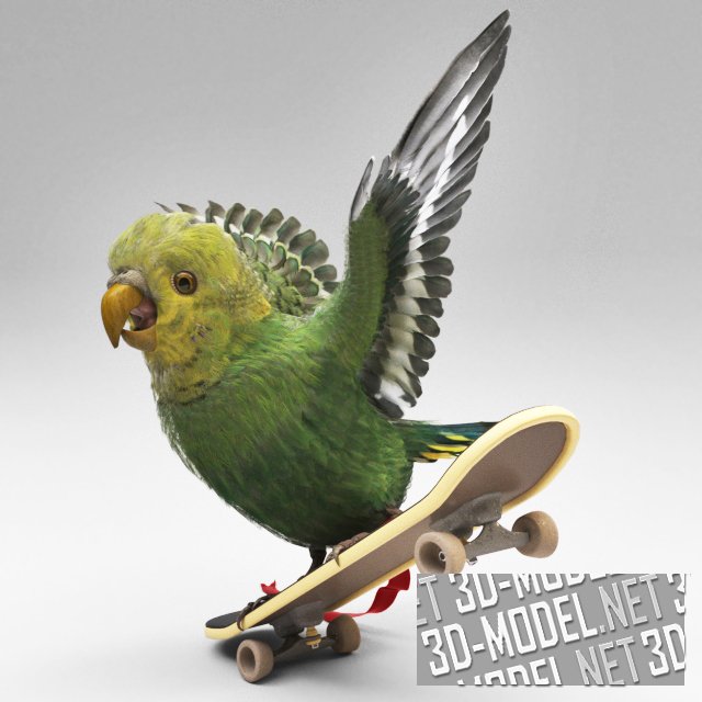 Реалистично выполненная трехмерная копия попугая с зеленым оперением, который катается на скейте. При этом вид у птицы весьма удивленный. Крылья помогают попугаю удержать равновесие.