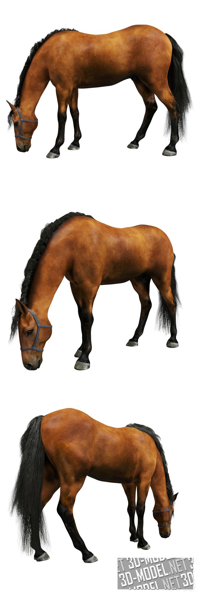 Пасущаяся гнедая (рыже-коричневая, с черными ногами, черной гривой и черным хвостом) лошадь. На морде животного - темно-серая уздечка. Голова лошади опущена к земле.