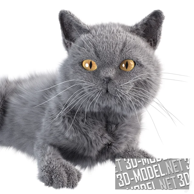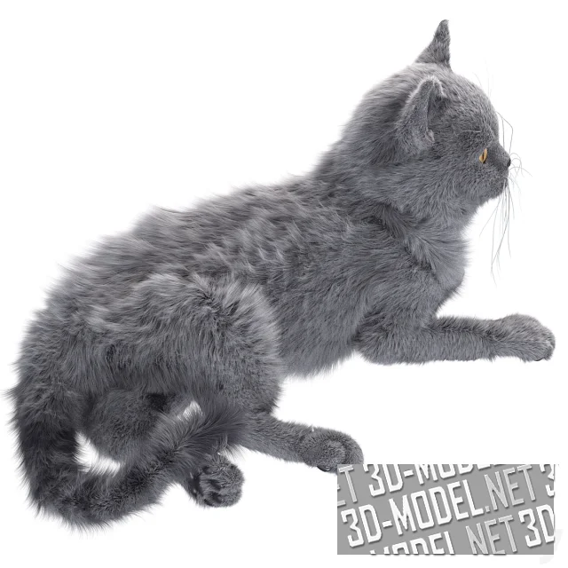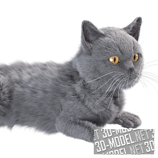 Очень реалистично выполненный желтоглазый кот с шерстью серого цвета. Животное в позе лежа, трехмерная модель высокого качества, что позволит создать красивые и реалистичные рендеры. Текстуры в архиве.