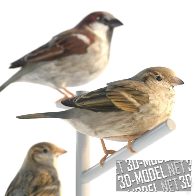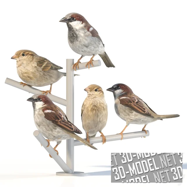 «Воробьиный домик» из белой металлической трубки на круглой площадке. Подставка выполнена в виде небольшой ветки с четырьмя жердочками разного размера. На «ветке» разместились воробьи (три самца и две самочки).