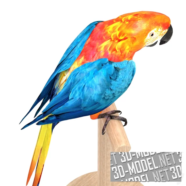 Сидящий на деревянной жердочке попугай ара. Разноцветная экзотическая птица выполнена реалистично, с вниманием к деталям.