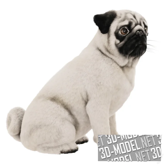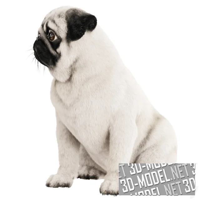 Забавный реалистичный сидящий пес породы мопс. Животное - белого цвета с черной мордочкой, ушками и кончиками лап. Умные коричневые глаза всматриваются в даль.