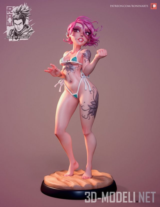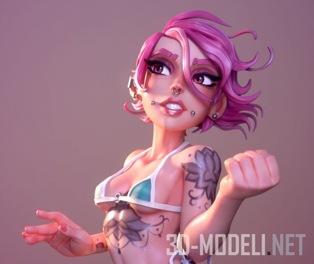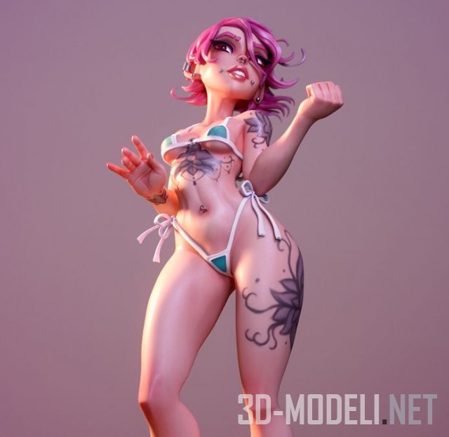 Фигурка эпатажной девушки Shirley в стиле Pin Up. У нее татуировки, пирсинг и розовые волосы, одета в бикини.